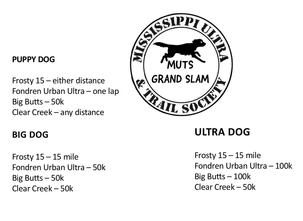 Run each of the 4 MUTS races to be eligible for the MUTS GRAND SLAM! We will celebrate you with special gifts and cheers at our annual party in January. The races are: Frosty 15, Fondren Urban Ultra, Big Butts, and Clear Creek Ultra.